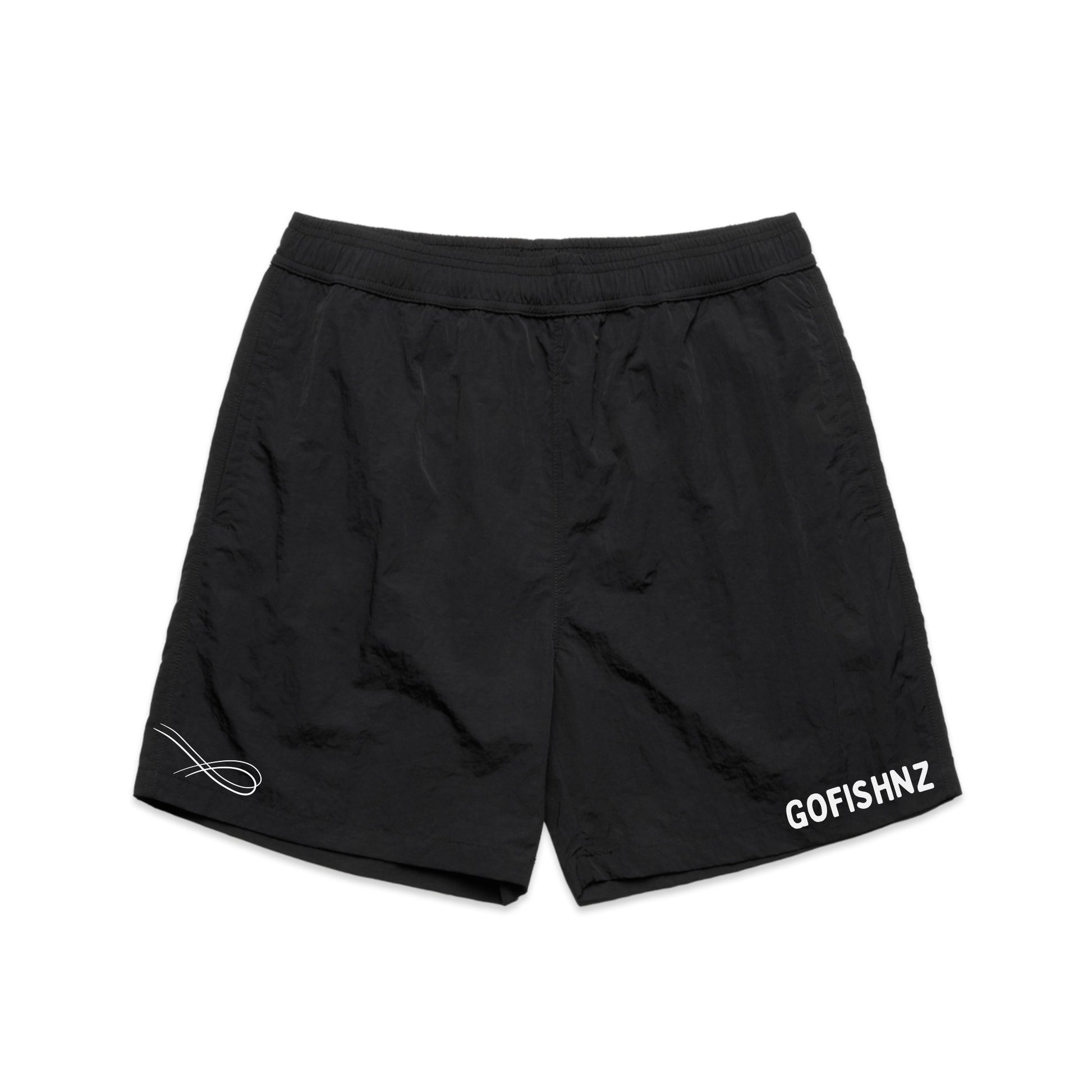 Lightweight swim shorts with the GOFISHNZ logo type embroidered in white on the left leg and our fish logo embroidered on the right leg. Built for comfort, quick-drying, and made for fishing, adventures, beach days, or everyday wear.